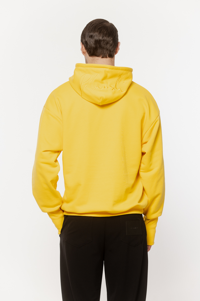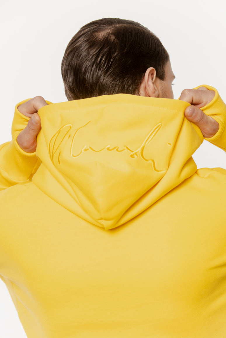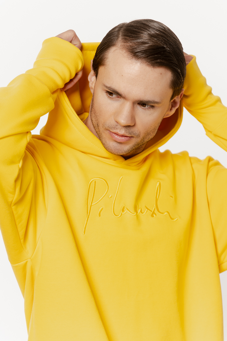 Z przodu oraz na kapturze żółty haft z logo.