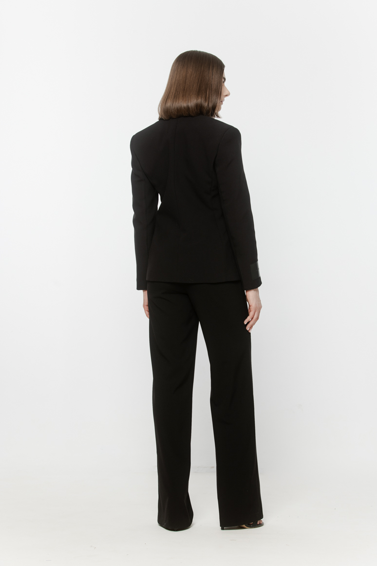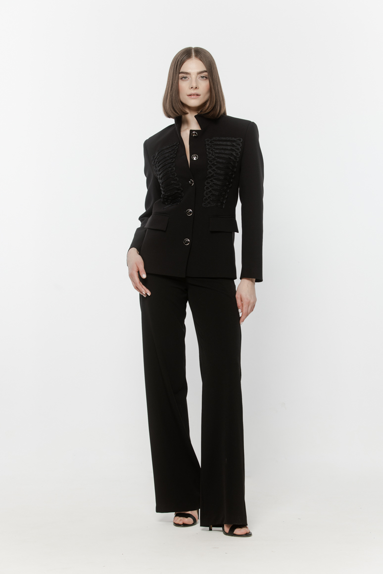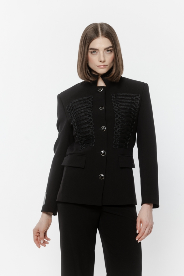Krótka, taliowana marynarka ze stójką.